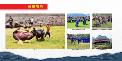 传统节日图片展示安顺特色的少数民族体育运动非物质文化遗产:斗牛、顶扁担、打蔑鸡蛋、扭杠子、芦笙舞。