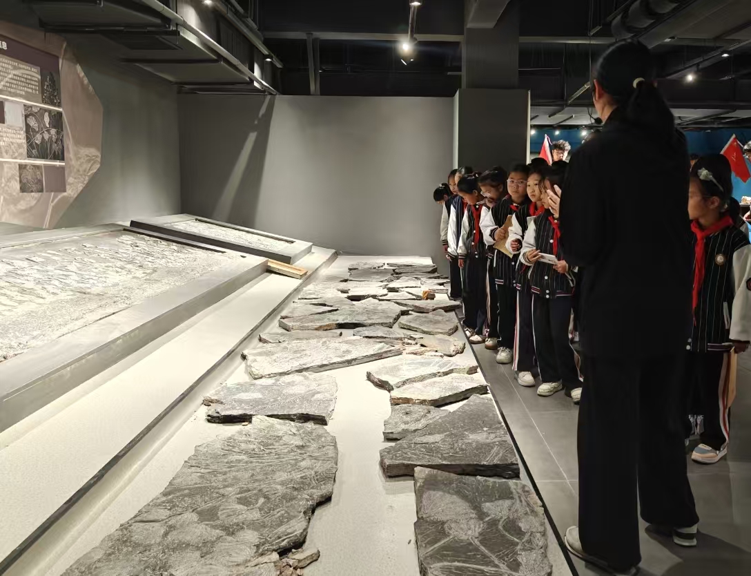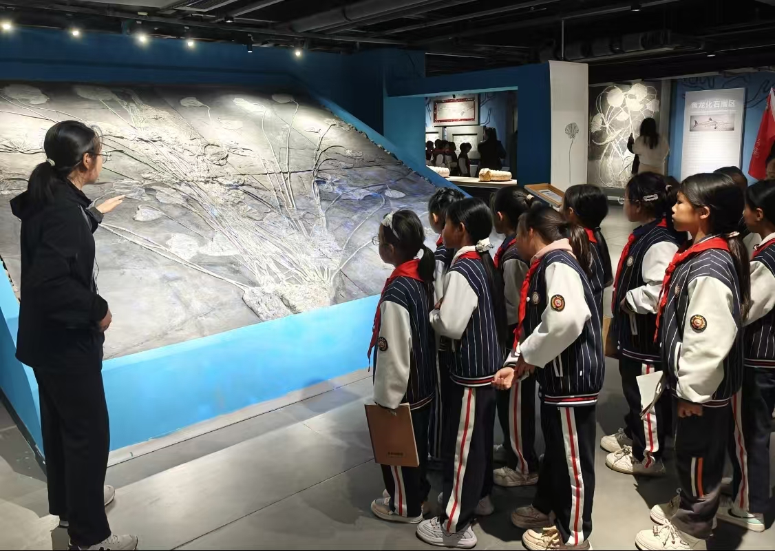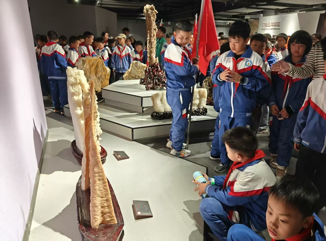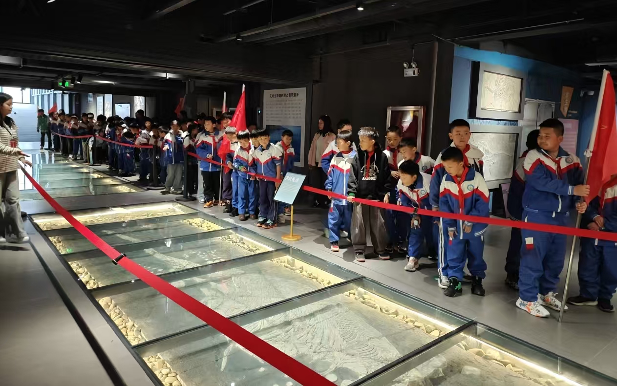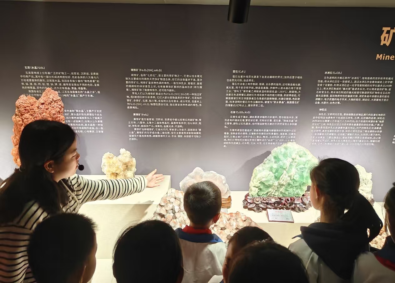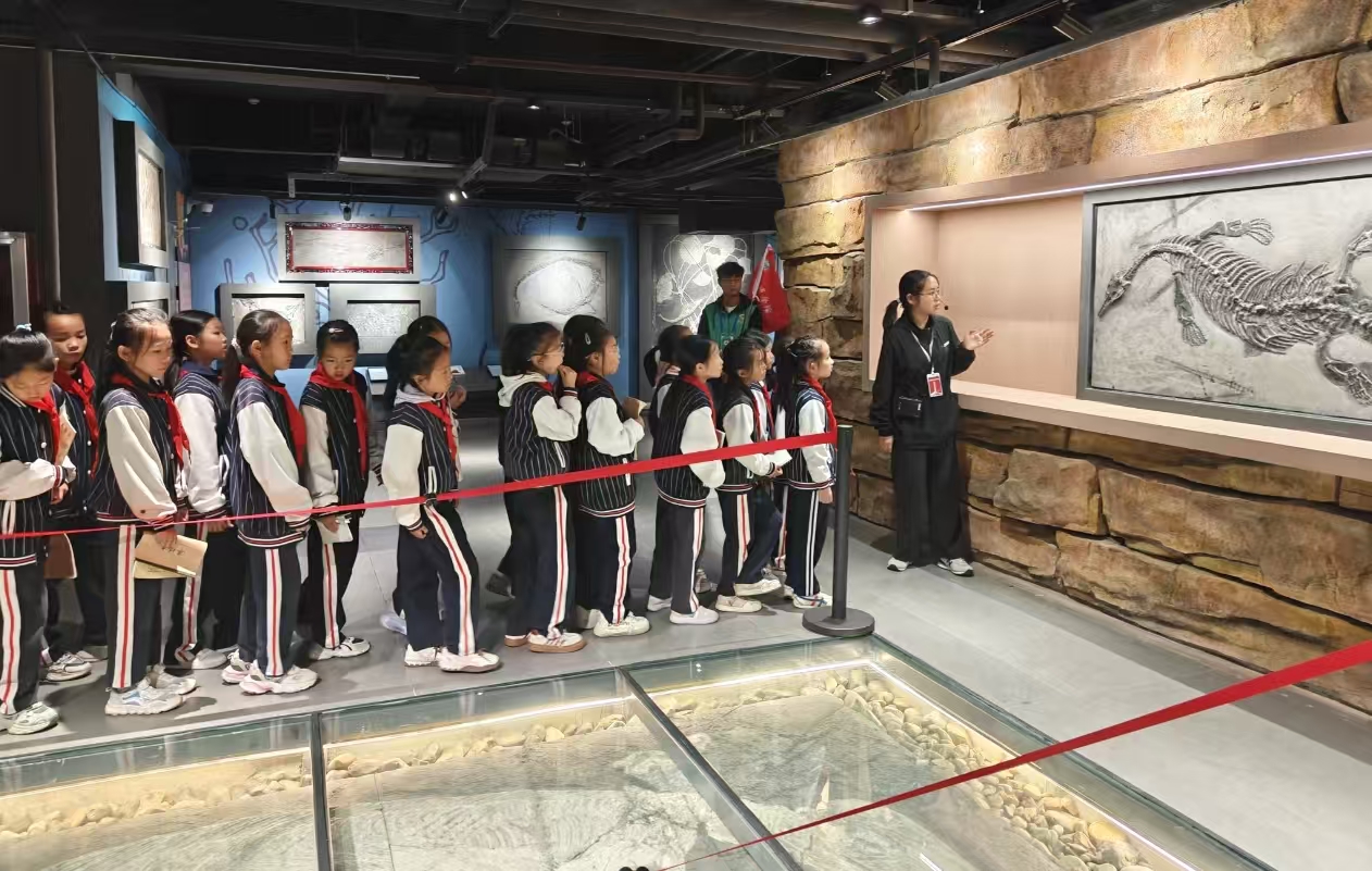 在参观过程中,博物馆讲解员为小学生们进行现场解说。一件件珍贵的古生物化石与奇石矿物不再是沉默的展品,而是成为认识贵州地质变迁、解读地球历史演化的生动教材。同学们通过近距离观察贵州喀斯特地貌标本、海相地层化石等特色展品,深入了解了家乡乃至西南地区的地质演化历程,激发了主动探索自然科学的兴趣。