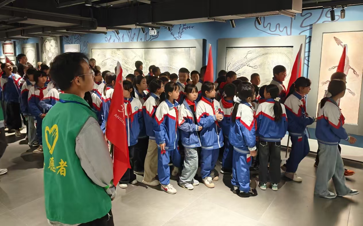 2025年10月22日下午,龙井小学与镇宁第四小学共计两百余名师生,分两组在宋生琼、马强老师的带队下,到我校博物馆开展研学参观活动。从地质博物馆起步,陈列科王楠老师组织志愿解说员进行讲解,志愿者队伍参与引导。