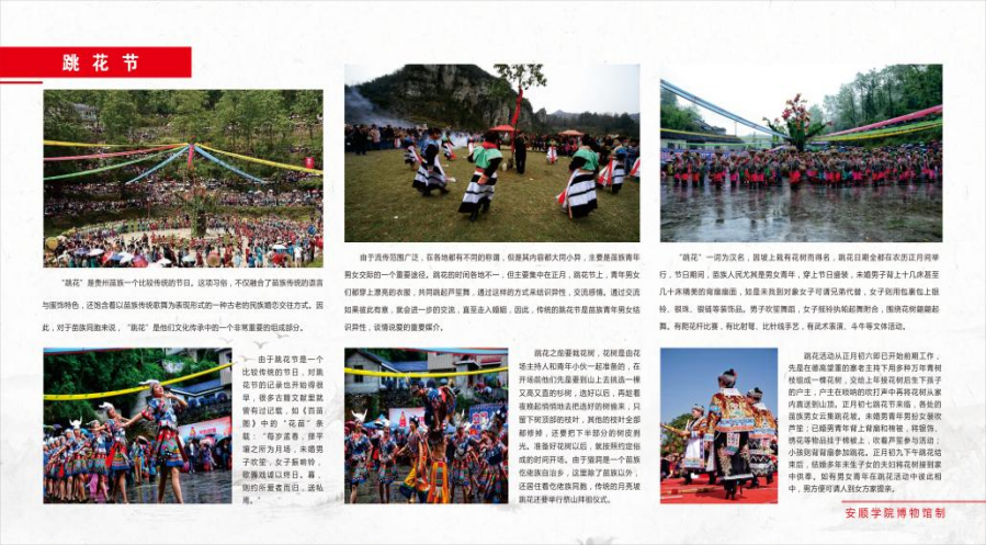 跳花节是安顺苗族最为隆重历史最为悠久的传统节日。传说是苗族英雄人物杨鲁兴起的,至今安顺北门外跳花山仍以其名命名。"跳花"一词仍汉名,因坡上栽有花树而得名,与苗语意思不尽相同,苗语称跳花为"欧道",意为"赶坡"。跳花日期全都在农历正月间举行,现仍有24处固定跳花坡。节日期间,苗族人民尤其是男女青年,穿上节日盛装,未婚男子背上十几床甚至几十床精美的背扇扇面,如是未找到对象女子可请兄弟代替,女子则用包裹包上银铃、银珠、银链等装饰品。男子吹笙舞蹈,女子摇铃执帕起舞附合,围绕花树翩翩起舞。有爬花杆比赛,有比射弩、比针线手艺,有武术表演、倒牛、斗牛等文体活动。