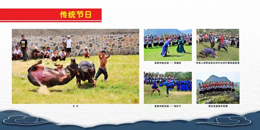 传统节日图片展示安顺特色的少数民族体育运动非物质文化遗产:斗牛、顶扁担、打蔑鸡蛋、扭杠子、芦笙舞。